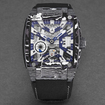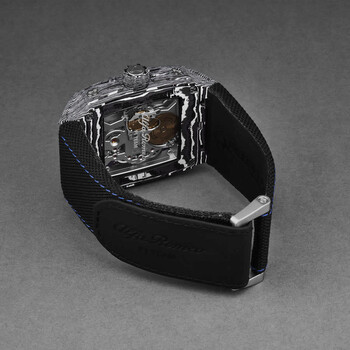 Black carbon fiber case with a black velcro band. Fixed blue carbon fiber bezel. Blue dial with blue hands and index hour markers. Minute markers around the outer rim. Dial Type: Analog. Luminescent hands and markers. Hand wind movement. Scratch resistant sapphire crystal. Pull / push crown. Transparent case back. Rectangle case shape, case size: 38.5 mm, case thickness: 12.5 mm. Band width: 30 mm. Fold over clasp. Water resistant at 30 meters / 100 feet. Functions: hour, minute, second. Additional Info: hour, minute, seconds. Re-volt Series. Luxury watch style. Rebellion Re-Volt Hand Wind Blue Dial Men's Watch RB.REV.3H.CA.VBO.