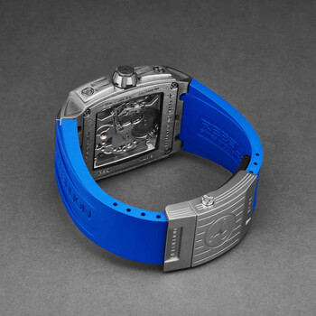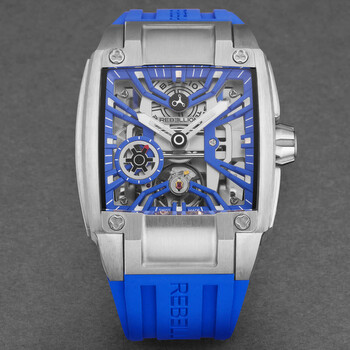 Grey titanium case with a blue rubber strap. Fixed grey titanium bezel. Blue dial with silver-tone hands and index hour markers. Minute markers around the outer rim. Dial Type: Analog. Luminescent hands and markers. Hand wind movement. Scratch resistant sapphire crystal. Pull / push crown. Transparent case back. Rectangle case shape, case size: 38.5 mm, case thickness: 12.5 mm. Band width: 30 mm. Deployment with push button release clasp. Water resistant at 30 meters / 100 feet. Functions: hour, minute, second. Additional Info: hour, minute, seconds. Re-volt Series. Luxury watch style. Rebellion Re-Volt Hand Wind Blue Dial Men's Watch RB.REV.3H.TI.BL.