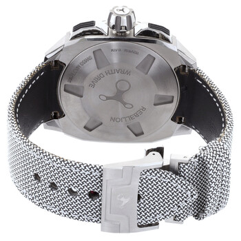 Silver-tone titanium case with a silver-tone velcro band. Fixed silver-tone titanium bezel. Silver-tone dial with silver-tone hands and index hour markers. Minute markers around the outer rim. Dial Type: Analog. Luminescent hands and markers. Date display at the 3 o'clock position. Automatic movement. Scratch resistant sapphire crystal. Screw down crown. Solid case back. Round case shape, case size: 47 mm, case thickness: 17 mm. Band width: 25 mm. Deployment with push button release clasp. Water resistant at 100 meters / 330 feet. Functions: chronograph, date, hour, minute, second. Additional Info: hours, minute, seconds, date, chronograph. Wraith Series. Luxury watch style. Rebellion Wraith Chronograph Automatic Silver Dial Men's Watch RB.WR.CH.TI.T01.