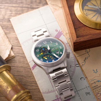 The Altitude Retrograde offers classic style and modern precision. Its Japanese quartz retrograde movement ensures accurate timekeeping, and the 46mm case diameter provides an elegant silhouette. The date display offers a convenience that will come in handy for daily use. Silver-tone stainless steel case and bracelet. Fixed silver-tone stainless steel bezel. Green dial with silver-tone hands and Arabic numeral hour markers. Minute markers around the outer rim. Dial Type: Analog. Luminescent hands and markers. Date display at the 4 o'clock position. Two sub-dials displaying: 24 hour and retrograde 24 hour. Miyota Caliber GP03 quartz movement. Scratch resistant mineral crystal. Pull / push crown. Solid case back. Round case shape, case size: 46 mm, case thickness: 13 mm. Band width: 22 mm, band length: 8 inches. Fold over clasp with a safety release. Water resistant at 50 meters / 165 feet. Functions: retrograde, big date, GMT, second time zone, hour, minute, second. Altitude Series. Casual watch style. Watch label: Japan Movt. Recta Altitude GMT Quartz Green Dial Men's Watch RT-3007-77.