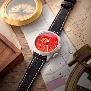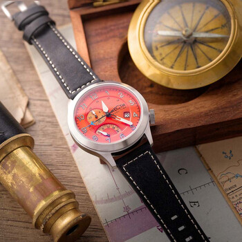 The Altitude Retrograde offers classic style and modern precision. Its Japanese quartz retrograde movement ensures accurate timekeeping, and the 46mm case diameter provides an elegant silhouette. The date display offers a convenience that will come in handy for daily use. Silver-tone stainless steel case with a brown genuine leather strap. Fixed silver-tone stainless steel bezel. Orange dial with silver-tone hands and Arabic numeral hour markers. Minute markers around the outer rim. Dial Type: Analog. Luminescent hands and markers. Date display at the 4 o'clock position. Two sub-dials displaying: 24 hour and retrograde 24 hour. Miyota Caliber GP03 quartz movement. Scratch resistant mineral crystal. Pull / push crown. Solid case back. Round case shape, case size: 46 mm, case thickness: 13 mm. Band width: 22 mm, band length: 8 inches. Water resistant at 50 meters / 165 feet. Functions: retrograde, big date, GMT, second time zone, hour, minute, second. Altitude Series. Casual watch style. Watch label: Japan Movt. Recta Altitude GMT Quartz Orange Dial Men's Watch RT-3007-08.