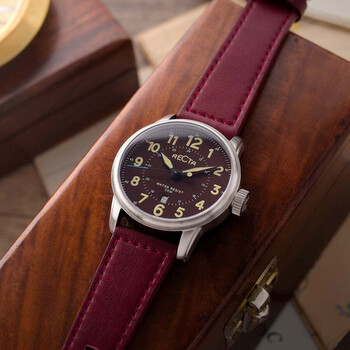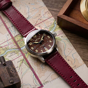 Built to last, the Altitude embodies the true spirit of the military-influenced 'Flieger' style of the timepiece with a bold hand, cleanly legible dials, and snug yet robust build that makes it an effortless and unrelenting timepiece to wear. Silver-tone stainless steel case with a brown genuine leather strap. Fixed silver-tone stainless steel bezel. Brown dial with black hands and Arabic numeral hour markers. Minute markers around the outer rim. Dial Type: Analog. Luminescent hands and markers. Date display at the 6 o'clock position. Seiko - VJ32 quartz movement. Scratch resistant mineral crystal. Pull / push crown. Solid case back. Round case shape, case size: 42 mm, case thickness: 12 mm. Band width: 22 mm, band length: 8 inches. Water resistant at 50 meters / 165 feet. Functions: date, hour, minute, second. Altitude Series. Casual watch style. Recta Altitude Quartz Brown Dial Men's Watch RT-3006-0A.