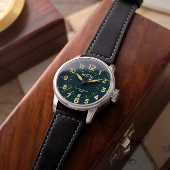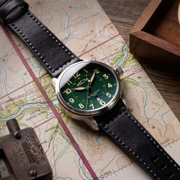 Built to last, the Altitude embodies the true spirit of the military-influenced 'Flieger' style of the timepiece with a bold hand, cleanly legible dials, and snug yet robust build that makes it an effortless and unrelenting timepiece to wear. Silver-tone stainless steel case with a black genuine leather strap. Fixed silver-tone stainless steel bezel. Green dial with black hands and Arabic numeral hour markers. Minute markers around the outer rim. Dial Type: Analog. Luminescent hands and markers. Date display at the 6 o'clock position. Seiko - VJ32 quartz movement. Scratch resistant mineral crystal. Pull / push crown. Solid case back. Round case shape, case size: 42 mm, case thickness: 12 mm. Band width: 22 mm, band length: 8 inches. Water resistant at 50 meters / 165 feet. Functions: date, hour, minute, second. Altitude Series. Casual watch style. Recta Altitude Quartz Green Dial Men's Watch RT-3006-06.
