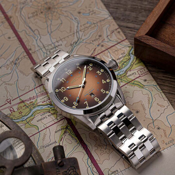 The Cavalier has a spirit of bravado that is anchored around a mission-critical need for functionality. It's fuss-free, reliable, and precise. Silver-tone stainless steel case and bracelet. Fixed silver-tone stainless steel bezel. Brown dial with silver-tone hands and Arabic numeral hour markers. Minute markers around the outer rim. Dial Type: Analog. Luminescent hands and markers. Date display at the 6 o'clock position. Seiko - VJ32 quartz movement. Scratch resistant mineral crystal. Pull / push crown. Solid case back. Round case shape, case size: 45 mm, case thickness: 12 mm. Band width: 24 mm, band length: 8 inches. Fold over clasp with a safety release. Water resistant at 50 meters / 165 feet. Functions: date, hour, minute, second. Cavalier Series. Casual watch style. Recta Cavalier Quartz Brown Dial Men's Watch RT-3005-66.