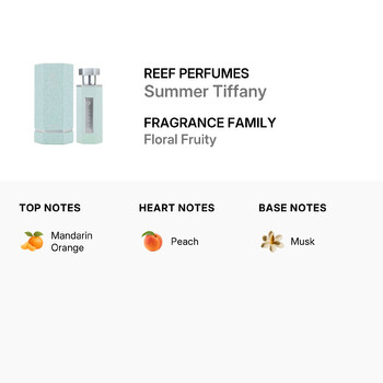 Packaged with care and style, Summer Tiffany EDP Spray is available exclusively in a 3.4 oz size and is valid for shipment only within the Contiguous United States and Canada. Discover a new way to express your style with a scent that captures the magic of endless summer—only from Reef Perfumes.