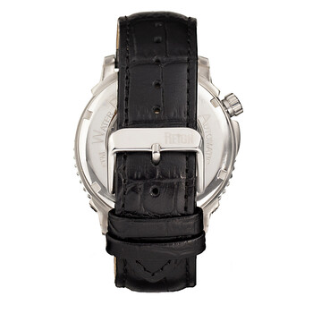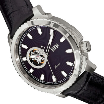 Stainless steel case with a black leather strap. Fixed stainless steel bezel. Black (open heart) dial with silver-tone sword-shaped hands and index hour markers. Arabic numeral minute markers (at 5 minute intervals). Minute markers around the outer rim. Dial Type: Analog. Luminescent hands and markers. Automatic movement. Scratch resistant mineral crystal. Pull / push crown. Semi-transparent case back. Round case shape. Case size: 44 mm. Case thickness: 12 mm. Band width: 22 mm. Band length: 9.75 inches. Tang clasp. Water resistant at 50 meters / 165 feet. Functions: hour, minute, second. Bauer Series. Casual watch style. Reign Bauer Automatic Black Dial Men's Watch REIRN6002.