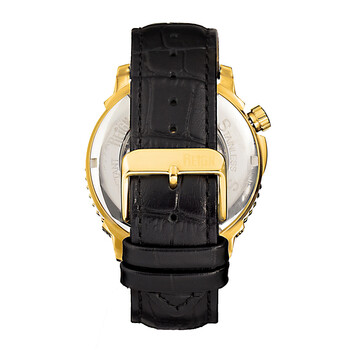 Gold-tone stainless steel case with a black genuine leather strap. Gold-tone stainless steel bezel. Black dial with gold-tone sword-shaped hands and n/a hour markers. Minute scale around the inner rim. Dial Type: Analog. Luminescent hands and markers. Automatic movement. Scratch resistant mineral crystal. Pull / push crown. Semi-transparent case back. Round case shape, case size: 44 mm, case thickness: 12 mm. Band width: 22 mm, band length: 9.75 inches. Buckle clasp. Water resistant at 50 meters / 165 feet. Functions: hour, minute, second. Casual watch style. Reign Bauer Automatic Black Dial Men's Watch REIRN6004.