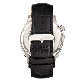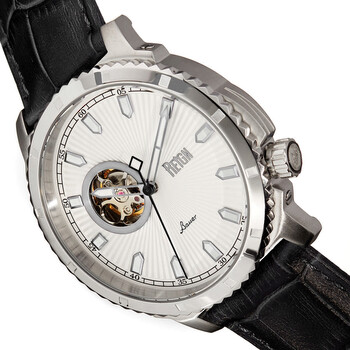 Stainless steel case with a black leather strap. Fixed stainless steel bezel. White (open heart) dial with silver-tone sword-shaped hands and index hour markers. Arabic numeral minute markers (at 5 minute intervals). Minute markers around the outer rim. Dial Type: Analog. Luminescent hands and markers. Automatic movement. Scratch resistant mineral crystal. Pull / push crown. Semi-transparent case back. Round case shape. Case size: 44 mm. Case thickness: 12 mm. Band width: 22 mm. Band length: 9.75 inches. Tang clasp. Water resistant at 50 meters / 165 feet. Functions: hour, minute, second. Bauer Series. Casual watch style. Reign Bauer Automatic White Dial Men's Watch REIRN6001.