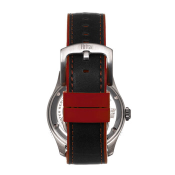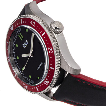 Band Color: Black Rubber Inlaid Leather; Band Width: 22mm near case; 20mm near clasp/buckle; Bezel Color: Red; Case: Silver + Circle-Shaped; Case Finish: Polished + Stainless Steel; Case Thickness: 15mm; Case Width: 42mm; 45mm with Crown; Clasp / Buckle: Strap Buckle; Dial: Black + Analog; Hand Color: Silver; Movement: Japanese + Automatic; Time Zones: Single; Water Resistance: 10 ATM.
