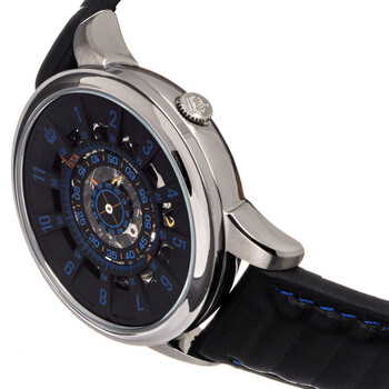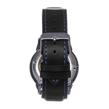 Silver-tone stainless steel case with a black genuine leather strap. Fixed silver-tone stainless steel bezel. Black dial with orange hands and Arabic numeral hour markers. Dial Type: Analog. Automatic movement. Scratch resistant mineral crystal. Pull / push crown. Transparent case back. Round case shape, case size: 42 mm, case thickness: 14 mm. Band width: 22 mm, band length: 8.5 inches. Buckle clasp. Water resistant at 100 meters / 330 feet. Functions: hour, minute, second. Monterey Series. Casual watch style. Reign Monterey Automatic Black Dial Men's Watch REIRN6402.