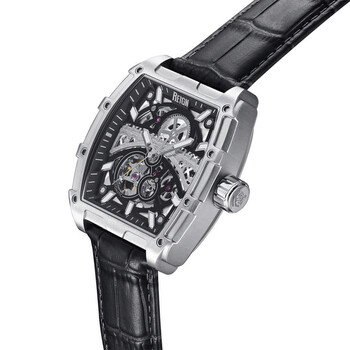 Silver-tone stainless steel case with a black genuine leather strap. Fixed silver-tone stainless steel bezel. Black dial with silver-tone hands and Arabic numeral hour markers. Minute markers around the outer rim. Dial Type: Analog. Luminescent hands and markers. Automatic movement. Pull / push crown. Tonneau case shape, case size: 42 mm, case thickness: 12 mm. Band width: 22 mm, band length: 9.75 inches. Buckle clasp. Water resistant at 100 meters / 330 feet. Functions: hour, minute, second. Olympia Series. Casual watch style. Reign Olympia Automatic Black Dial Men's Watch REIRN5602.