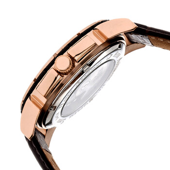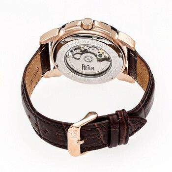 Rose gold-tone stainless steel case with a brown leather strap. Fixed black-plated bezel with a rose gold-tone top ring. Black (skeleton center) dial with luminous rose gold-tone hands and Roman numeral hour markers. Dial Type: Analog. Luminescent hands and markers. Automatic movement. Scratch resistant mineral crystal. Pull / push crown. Transparent case back. Round case shape. Case size: 44 mm. Case thickness: 13 mm. Band width: 21 mm. Tang clasp. Water resistant at 50 meters / 165 feet. Functions: hour, minute, second. Philippe Series. Dress watch style. Item Variations: REIRN4606. Reign Philippe Automatic Black Dial Men's Watch REIRN4606.