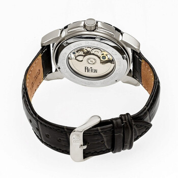 Stainless steel case with a black (croco-embossed) leather strap. Fixed stainless steel bezel with a black ring. Silver skeleton dial with luminous silver-tone hands and Roman numeral hour markers. Dial Type: Analog. Luminescent hands and markers. Automatic movement with a 42-hour power reserve. Scratch resistant sapphire-coated mineral crystal. Pull / push crown. Transparent case back. Round case shape. Case size: 41 mm. Case thickness: 13 mm. Band width: 20 mm. Tang clasp. Water resistant at 50 meters / 165 feet. Functions: hour, minute, second. Additional Info: average gain/loss rate: +/- 45 seconds per day. Philippe Series. Casual watch style. Reign Philippe Automatic Silver Skeleton Dial Men's Watch RN4603.
