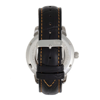 Silver-tone 316L stainless steel case with a black 316L stainless steel bracelet. Fixed silver-tone stainless steel bezel. Black dial with silver-tone hands. Minute markers around the outer rim. Dial Type: Analog. Luminescent hands. One - open heart subdial. Miyota Caliber 82SO automatic movement with a 42-hour power reserve. Scratch resistant mineral crystal. Pull / push crown. Transparent case back. Round case shape, case size: 42 mm, case thickness: 13 mm. Band width: 20 mm. Box with tongue and safety clasp. Water resistant at 50 meters / 165 feet. Functions: hour, minute, second. Casual watch style. Watch label: Japan Movt. Item Variations: REIRN5902. Reign Rudolf Automatic Black Dial Men's Watch REIRN5902.