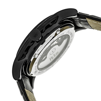 Black IP 316l surgical stainless steel case with a black embossed leather strap. Fixed bezel. Black skeleton dial with black-tone hands. Dial Type: Analog. Automatic movement with about 36 hours of power reserve. Scratch resistant sapphire-coated mineral crystal. Transparent case back. Case size: 44 mm. Round case shape. Tang clasp. Water resistant at 50 meters / 165 feet. Functions: hour, minute, second. Casual watch style. Reign Stavros Black Skeleton Dial Black Leather Men's Watch RN3705.