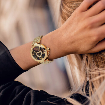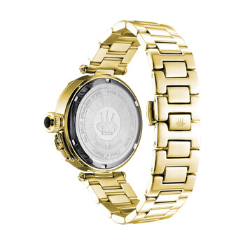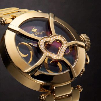 Yellow gold-tone stainless steel case and bracelet. Fixed yellow gold-tone bezel. Mother of pearl (crystal-set heart) dial with yellow gold-tone hands. Stylized Arabic numerals appear at the 3, 6 and 9 o'clock positions. Dial Type: Analog. Quartz movement. Scratch resistant mineral crystal. Pull / push crown. Solid case back. Round case shape. Case size: 38 mm. Case thickness: 12 mm. Band width: 18 mm. Band length: 6.5 inches. Deployment clasp with a push button release. Water resistant at 50 meters / 165 feet. Functions: hour, minute, second. Coeur D'amour Series. Fashion watch style. Rene Mouris Coeur DAmour Mother of Pearl Dial Ladies Watch 50102RM5.