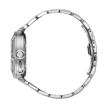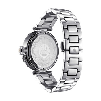 Stainless steel case with a stainless steel bracelet. Fixed stainless steel bezel set with crystals. Mother of pearl (heart) dial with silver-tone hands. Stylized Arabic numerals appear at the 3, 6 and 9 o'clock positions. Dial Type: Analog. Quartz movement. Scratch resistant mineral crystal. Pull / push crown. Solid case back. Round case shape. Case size: 38 mm. Case thickness: 12 mm. Band width: 18 mm. Band length: 6.5 inches. Deployment with push button release clasp. Water resistant at 50 meters / 165 feet. Functions: hour, minute, second. Coeur D'amour Series. Fashion watch style. Rene Mouris Coeur DAmour Mother of Pearl Dial Ladies Watch 50103RM1.