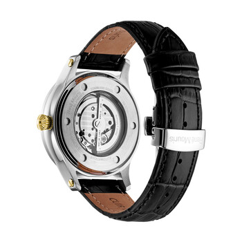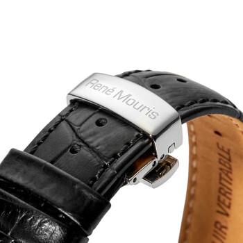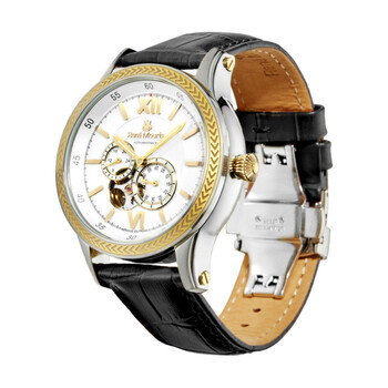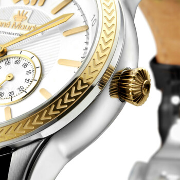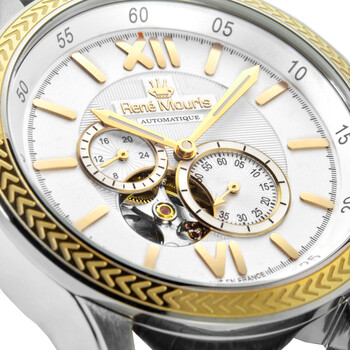 Stainless steel case with a two-tone (silver-tone and yellow gold-tone) stainless steel bracelet. Fixed yellow gold-tone bezel. White (open heart) dial with yellow gold-tone hands and index hour markers. Roman numerals appear at the 6 and 12 o'clock positions. Minute markers. Arabic numeral minute markers (at 5 minute intervals) around the outer rim. Dial Type: Analog. Luminescent hands. Chronograph - two sub-dials displaying: 24 hour and 60 seconds. Automatic movement. Scratch resistant mineral crystal. Pull / push crown. Transparent case back. Round case shape. Case size: 44 mm. Case thickness: 13 mm. Band width: 22 mm. Band length: 8.27 inches. Deployment with push button release clasp. Water resistant at 100 meters / 330 feet. Functions: chronograph, hour, minute, second. Corona Series. Dress watch style. Rene Mouris Corona Chronograph Automatic White Dial Men's Watch 70105RM4.