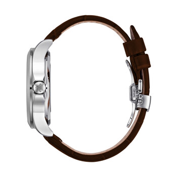 Silver-tone stainless steel case with a brown genuine leather strap. Fixed silver-tone stainless steel bezel. Brown dial with silver-tone hands and Arabic numeral & index hour markers. Minute scale around the inner rim. Dial Type: Analog. Luminescent hands and markers. Date display at the 3 o'clock position. 24 hour subdials. Automatic movement. Scratch resistant mineral crystal. Pull / push crown. Transparent case back. Round case shape, case size: 44 mm, case thickness: 13 mm. Band width: 22 mm, band length: 8.46 inches. Deployment with push button release clasp. Water resistant at 100 meters / 330 feet. Functions: hour, minute, second, power reserve. Cygnus Series. Dress watch style. Rene Mouris Cygnus Automatic Brown Dial Men's Watch 70103RM3.