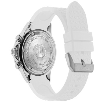 The Dream I is inspired by dream catchers, Native American inventions created to deflect bad dreams. This has been translated through a patterned dial that pays homage to the dream catchers’ strings and round mother-ofpearl sub dials. This collection has been expertly crafted from the highest-grade stainless steel and decorated the bezel with a ceramic ring. Silver-tone stainless steel case with a white silicone strap. Fixed pink ceramic bezel. Two-tone dial with silver-tone hands and index hour markers. Dial Type: Analog. Luminescent hands. Between the 4 and 5 o'clock position. Chronograph - sub-dials displaying: 24 hour, 60 minute, 60 second. Quartz movement. Scratch resistant mineral crystal. Pull / push crown. Solid case back. Round case shape, case size: 38 mm, case thickness: 11 mm. Band width: 18 mm. Buckle clasp. Water resistant at 50 meters / 165 feet. Functions: chronograph, date, hour, minute, second, sport, water resistant. Additional Info: mother of pearl sub-dial. Dream I Series. Sport watch style. Watch label: French Made. Rene Mouris Dream I Chronograph Two-tone Dial Ladies Watch 50108RM3.