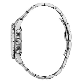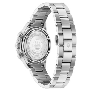 Stainless steel case with a stainless steel bracelet. Fixed stainless steel bezel with an inlaid white ceramic ring. Mother of pearl dial with silver-tone hands and index hour markers. Roman numeral appears at the 12 o'clock position. Dial Type: Analog. Luminescent hands. Date display between the 4 and 5 o'clock positions. Chronograph - three sub-dials displaying: 60 second, 60 minute and 24 hour. Quartz movement. Scratch resistant mineral crystal. Pull / push crown. Solid case back. Round case shape. Case size: 38 mm. Case thickness: 11 mm. Band width: 18 mm, band length: 7.5 inches. Deployment clasp with a push button release. Water resistant at 50 meters / 165 feet. Functions: chronograph, date, hour, minute, second. Additional Info: 60-minute chronograph, 24 hour. Dream-i Series. Casual watch style. Rene Mouris DREAM-I Chronograph Mother of Pearl Dial Ladies Watch 50107RM1.