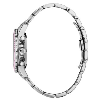 The DREAM-I is inspired by dream catchers, Native American inventions created to deflect bad dreams. This has been translated though a patterned dial that pays homage to the dream catchers’ strings and round mother-of-pearl sub dials. The watch has been expertly crafted from the highest-grade stainless steel and the bezel is decorated with a ceramic ring. The watches can be fitted with stainless steel bracelets or silicone straps. Silver-tone stainless steel case and bracelet. Fixed pink ceramic bezel. Mother of pearl dial with silver-tone hands and Roman numeral & index hour markers. Dial Type: Analog. Luminescent hands. Between the 4 and 5 o'clock position. Chronograph - three sub-dials displaying: 60 second, 60 minute and 24 hour. Quartz movement. Scratch resistant mineral crystal. Pull / push crown. Solid case back. Round case shape, case size: 38 mm, case thickness: 11 mm. Band width: 18 mm, band length: 7.5 inches. Deployment with push button release clasp. Water resistant at 50 meters / 165 feet. Functions: chronograph, date, hour, minute, second. Additional Info: 60-minute chronograph, 24 hour. Dream-i Series. Sport watch style. Rene Mouris DREAM-I Chronograph Mother of Pearl Dial Ladies Watch 50107RM3.
