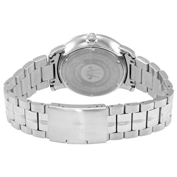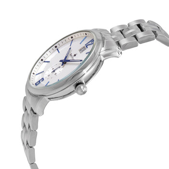 Executive collection is a classic quartz timepiece. It has a contemporary, minimalist interpretation of a timeless design. Its blend of sophistication and modernity makes it the perfect watch to wear to work and on the weekend. Stainless steel case with a stainless steel bracelet. Fixed stainless steel bezel. Silver / white dial with luminous blue hands and index hour markers. Arabic numerals appear at the 6 and 12 o'clock positions. Minute markers around the outer rim. Dial Type: Analog. Luminescent hands. Date display below the 12 o'clock position. 60 seconds sub-dial. Quartz movement. Scratch resistant mineral crystal. Pull / push crown. Solid case back. Round case shape. Case size: 44 mm. Case thickness: 11 mm. Band width: 20 mm. Band length: 8.27 inches. Deployment clasp with a push button release. Water resistant at 50 meters / 165 feet. Functions: date, hour, minute. Executive Series. Casual watch style. Watch label: French Made. Rene Mouris Executive Silver White Dial Men's Watch 80102RM2.
