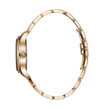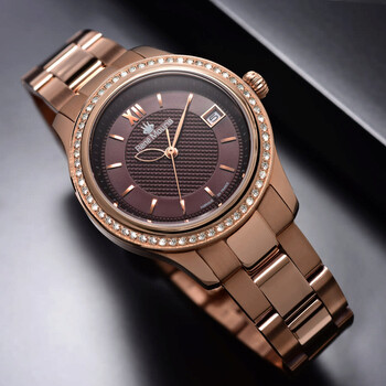 Lola is about a perpetual love once you in love with its elegant look and appealing personality. Rose gold PVD stainless steel case and bracelet. Fixed rose gold PVD stainless steel set with crystals bezel. Brown dial with rose gold-tone hands and index hour markers. A Roman numeral appear at the 12 o'clock position. Minute markers around the outer rim. Dial Type: Analog. Date display at the 3 o'clock position. Quartz movement. Scratch resistant mineral crystal. Pull / push crown. Solid case back. Round case shape. Case size: 34 mm. Case thickness: 9 mm. Band width: 16 mm. Deployment clasp with a push button release. Water resistant at 50 meters / 165 feet. Functions: date, hour, minute, second. Lola Series. Fashion watch style. Rene Mouris Lola Brown Dial Ladies Watch 50113RM4.