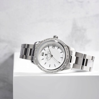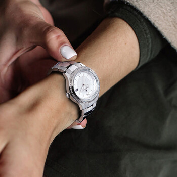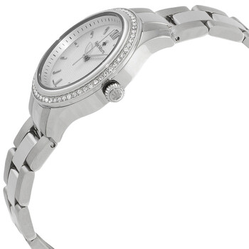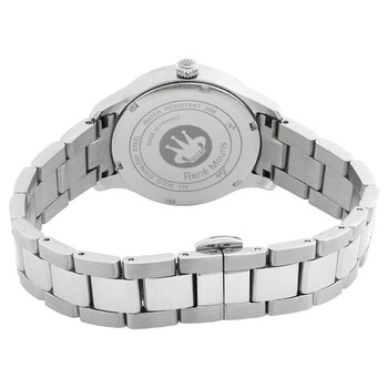 Stainless steel case with a stainless steel bracelet. Fixed stainless steel bezel set with 60 crystals. White dial with silver-tone hands and index hour markers. Minute markers around the outer rim. Dial Type: Analog. Date display at the 3 o'clock position. Quartz movement. Scratch resistant mineral crystal. Pull / push crown. Solid case back. Round case shape. Case size: 34 mm. Case thickness: 9 mm. Band width: 16 mm. Fold over clasp with a push button release. Water resistant at 100 meters / 330 feet. Functions: date, hour, minute, second. Lola Series. Fashion watch style. Rene Mouris Lola White Dial Ladies Watch 50113RM1.