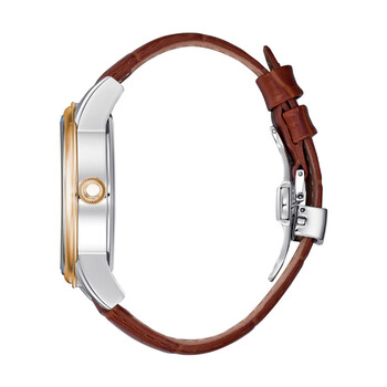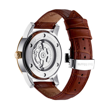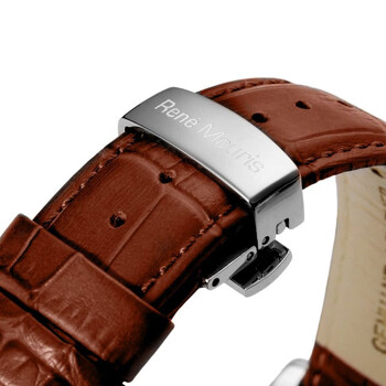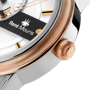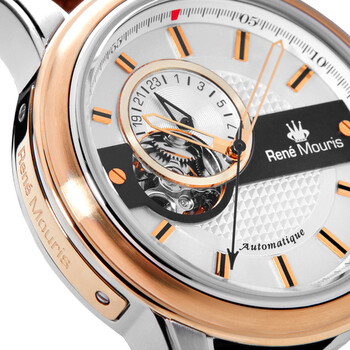 Silver-tone stainless steel case with a brown leather strap. Fixed rose gold-tone stainless steel bezel. White dial with rose gold-tone hands and index hour markers. Minute scale around the inner rim. Dial Type: Analog. 24 hour subdials. Automatic movement. Scratch resistant mineral crystal. Pull / push crown. Transparent case back. Round case shape, case size: 44 mm, case thickness: 13 mm. Band width: 22 mm, band length: 8.26 inches. Deployment with push button release clasp. Water resistant at 100 meters / 330 feet. Functions: hour, minute, second. Orion Series. Dress watch style. Watch label: French Made, Japan Movt. Rene Mouris Orion Automatic White Dial Men's Watch 70101RM3.