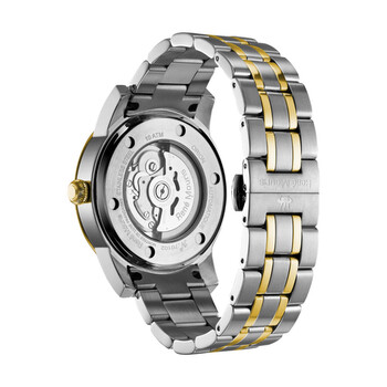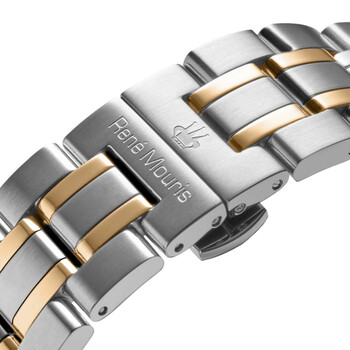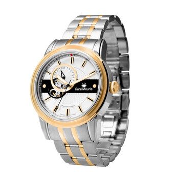 Silver-tone stainless steel case with a two-tone (silver-tone and yellow gold-tone) stainless steel bracelet. Fixed yellow gold-tone stainless steel bezel. White dial with yellow gold-tone hands and index hour markers. Minute scale around the inner rim. Dial Type: Analog. Luminescent hands. 24 hour subdials. Automatic movement. Scratch resistant mineral crystal. Pull / push crown. Transparent case back. Round case shape, case size: 44 mm, case thickness: 13 mm. Band width: 22 mm, band length: 8.07 inches. Deployment with push button release clasp. Water resistant at 100 meters / 330 feet. Functions: hour, minute, second. Orion Series. Fashion watch style. Watch label: French Made, Japan Movt. Rene Mouris Orion Automatic White Dial Men's Watch 70102RM4.