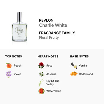 Charlie White opens with crisp top notes of juicy peach and delicate violet, setting a sweet and inviting tone. As the fragrance unfolds, a graceful bouquet of rose, jasmine, lily of the valley, and refreshing watermelon creates a soft, feminine heart that feels both calming and uplifting. Finally, the scent settles into a smooth, comforting base of warm vanilla and earthy cedarwood, leaving a gentle trail that lingers beautifully.