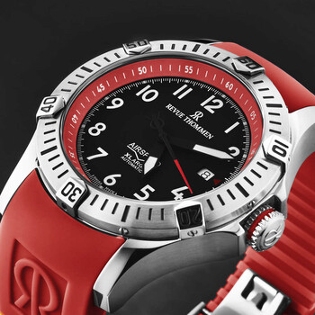 Silver-tone stainless steel case with a red rubber strap. Uni-directional rotating silver-tone stainless steel bezel. Black dial with black hands and Arabic numeral hour markers. Minute markers around the outer rim. Dial Type: Analog. Luminescent hands and markers. Date display at the 3 o'clock position. Sellita Calibre SW221-1 Automatic movement, containing 26 Jewels, bitting at 28800 vph, and has a power reserve of approximately 38 hours. Scratch resistant sapphire crystal. Screw down crown. Transparent case back. Round case shape, case size: 43.5 mm, case thickness: 13 mm. Band width: 22 mm, band length: 8 inches. Deployment with push button release clasp. Water resistant at 100 meters / 330 feet. Functions: date, hour, minute, second. Additional Info: hours, minutes, seconds, date. Air Speed Series. Casual watch style. Watch label: Swiss Made. Revue Thommen Air speed Automatic Black Dial Men's Watch 16070.4736.