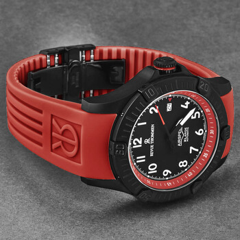 Black stainless steel case with a red rubber strap. Uni-directional rotating black stainless steel bezel. Black dial with black hands and Arabic numeral hour markers. Minute markers around the outer rim. Dial Type: Analog. Luminescent hands and markers. Date display at the 3 o'clock position. Sellita Calibre SW221-1 Automatic movement, containing 26 Jewels, bitting at 28800 vph, and has a power reserve of approximately 38 hours. Scratch resistant sapphire crystal. Screw down crown. Transparent case back. Round case shape, case size: 43.5 mm, case thickness: 13 mm. Band width: 22 mm, band length: 8 inches. Deployment with push button release clasp. Water resistant at 100 meters / 330 feet. Functions: date, hour, minute, second. Additional Info: hours, minutes, seconds, date. Air Speed Series. Casual watch style. Watch label: Swiss Made. Revue Thommen Air speed Automatic Black Dial Men's Watch 16070.4776.