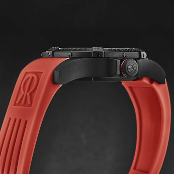 Black stainless steel case with a red rubber strap. Uni-directional rotating black stainless steel bezel. Black dial with silver-tone hands and index hour markers. Minute markers around the outer rim. Dial Type: Analog. Luminescent hands and markers. Date display at the 3 o'clock position. Sellita Calibre SW221-1 Automatic movement, containing 26 Jewels, bitting at 28800 vph, and has a power reserve of approximately 38 hours. Scratch resistant sapphire crystal. Screw down crown. Transparent case back. Round case shape, case size: 43.5 mm, case thickness: 13 mm. Band width: 22 mm, band length: 8 inches. Deployment with push button release clasp. Water resistant at 100 meters / 330 feet. Functions: date, hour, minute, second. Additional Info: hours, minutes, seconds, date. Air Speed Series. Casual watch style. Watch label: Swiss Made. Revue Thommen Air speed Automatic Black Dial Men's Watch 16070.4676.