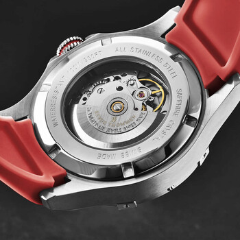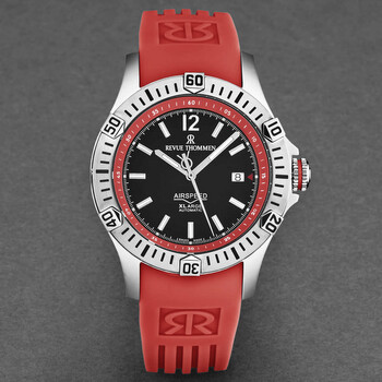 Silver-tone stainless steel case with a red rubber strap. Uni-directional rotating silver-tone stainless steel bezel. Black dial with silver-tone hands and index hour markers. Minute markers around the outer rim. Dial Type: Analog. Luminescent hands and markers. Date display at the 3 o'clock position. Sellita Calibre SW221-1 Automatic movement, containing 26 Jewels, bitting at 28800 vph, and has a power reserve of approximately 38 hours. Scratch resistant sapphire crystal. Screw down crown. Transparent case back. Round case shape, case size: 43.5 mm, case thickness: 13 mm. Band width: 22 mm, band length: 8 inches. Deployment with push button release clasp. Water resistant at 100 meters / 330 feet. Functions: date, hour, minute, second. Additional Info: hours, minutes, seconds, date. Air Speed Series. Casual watch style. Watch label: Swiss Made. Revue Thommen Air speed Automatic Black Dial Men's Watch 16070.4636.