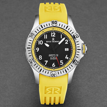 Silver-tone stainless steel case with a yellow rubber strap. Uni-directional rotating silver-tone stainless steel bezel. Black dial with black hands and Arabic numeral hour markers. Minute markers around the outer rim. Dial Type: Analog. Luminescent hands and markers. Date display at the 3 o'clock position. Sellita Calibre SW221-1 Automatic movement, containing 26 Jewels, bitting at 28800 vph, and has a power reserve of approximately 38 hours. Scratch resistant sapphire crystal. Screw down crown. Transparent case back. Round case shape, case size: 43.5 mm, case thickness: 13 mm. Band width: 22 mm, band length: 8 inches. Deployment with push button release clasp. Water resistant at 100 meters / 330 feet. Functions: date, hour, minute, second. Additional Info: hours, minutes, seconds, date. Air Speed Series. Casual watch style. Watch label: Swiss Made. Revue Thommen Air speed Automatic Black Dial Men's Watch 16070.4738.