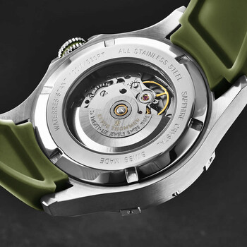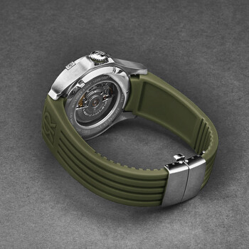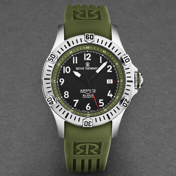 Silver-tone stainless steel case with a green rubber strap. Uni-directional rotating silver-tone stainless steel bezel. Black dial with black hands and Arabic numeral hour markers. Minute markers around the outer rim. Dial Type: Analog. Luminescent hands and markers. Date display at the 3 o'clock position. Sellita Calibre SW221-1 Automatic movement, containing 26 Jewels, bitting at 28800 vph, and has a power reserve of approximately 38 hours. Scratch resistant sapphire crystal. Screw down crown. Transparent case back. Round case shape, case size: 43.5 mm, case thickness: 13 mm. Band width: 22 mm, band length: 8 inches. Deployment with push button release clasp. Water resistant at 100 meters / 330 feet. Functions: date, hour, minute, second. Additional Info: hours, minutes, seconds, date. Air Speed Series. Casual watch style. Watch label: Swiss Made. Revue Thommen Air speed Automatic Black Dial Men's Watch 16070.4734.
