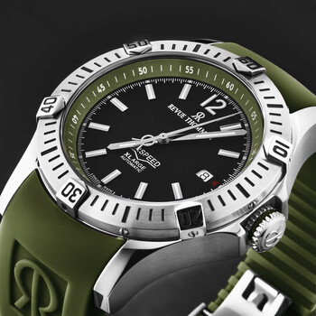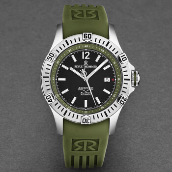 Silver-tone stainless steel case with a green rubber strap. Uni-directional rotating silver-tone stainless steel bezel. Black dial with silver-tone hands and index hour markers. Minute markers around the outer rim. Dial Type: Analog. Luminescent hands and markers. Date display at the 3 o'clock position. Calibre SW221-1 automatic movement. Scratch resistant sapphire crystal. Screw down crown. Transparent case back. Round case shape, case size: 43.5 mm, case thickness: 13 mm. Band width: 22 mm, band length: 8 inches. Deployment with push button release clasp. Water resistant at 100 meters / 330 feet. Functions: date, hour, minute, second. Additional Info: hours, minutes, seconds, date. Air Speed Series. Luxury watch style. Watch label: Swiss Made. Revue Thommen Air Speed Automatic Black Dial Men's Watch 16070.4634.