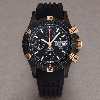Black PVD stainless steel case with a black rubber strap. Uni-directional black PVD bezel. Black dial with luminous rose-tone hands and indices hour markers. Minute markers. Tachymeter markings around the outer rim. Dial Type: Analog. Luminescent hands and markers. Day of the week and date display at the 3 o'clock position. Chronograph - three sub-dials displaying: 60 second, 30 minute and 12 hour. ETA-Valjoux caliber 7750 automatic movement, containing 25 Jewels, bitting at 28800 vph, and has a power reserve of approximately 44 hours. Scratch resistant sapphire crystal. Screw down crown. Transparent case back. Round case shape. Case size: 43.5 mm. Case thickness: 15.6 mm. Band width: 22 mm, band length: 8 inches. Deployment clasp. Water resistant at 100 meters / 330 feet. Functions: chronograph, tachymeter, date, day of the week, hour, minute, second. Air Speed Series. Sport watch style. Watch label: Swiss Made. Revue Thommen Air Speed Chronograph Automatic Black Dial Men's Watch 16071.6887.