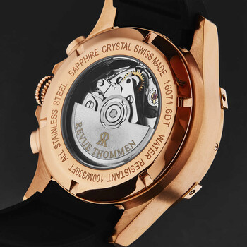Rose gold-tone stainless steel case with a black rubber strap. Uni-directional rotating rose gold-tone stainless steel bezel. Black dial with rose gold-tone hands and index hour markers. Minute markers around the outer rim. Dial Type: Analog. Day of the week and date display at the 3 o'clock position. Chronograph - three sub-dials displaying: 60 second, 30 minute and 12 hour. ETA-Valjoux Caliber 7750 Automatic movement, containing 25 Jewels, bitting at 28800 vph, and has a power reserve of approximately 44 hours. Scratch resistant sapphire crystal. Screw down crown. Transparent case back. Round case shape, case size: 43.5 mm, case thickness: 15.6 mm. Band width: 22 mm, band length: 8 inches. Deployment with push button release clasp. Water resistant at 100 meters / 330 feet. Functions: chronograph, date, day, hour, minute, second. Additional Info: hours, minutes, seconds, day-date, chronograph. Air Speed Series. Sport watch style. Watch label: Swiss Made. Revue Thommen Air speed Chronograph Automatic Black Dial Men's Watch 16071.6667.