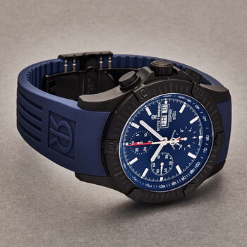 Black PVD stainless steel case with a blue rubber strap. Uni-directional rotating blackPVD bezel. Blue dial with luminous silver-tone hands and index hour markers. Minute markers. Tachymeter markings around the outer rim. Dial Type: Analog. Luminescent hands and markers. Day of the week and date display at the 3 o'clock position. Chronograph - three sub-dials displaying: 60 second, 30 minute and 12 hour. Automatic movement with a 44-hour power reserve. Scratch resistant sapphire crystal. Screw down crown. Transparent case back. Round case shape. Case size: 43.5 mm. Case thickness: 15.6 mm. Band width: 22 mm. Band length: 8 inches. Deployment clasp. Water resistant at 100 meters / 330 feet. Functions: hour, minute, second, day, date, chronograph, tachymeter. Air Speed Series. Casual watch style. Watch label: Swiss Made. Revue Thommen Air speed Chronograph Automatic Blue Dial Men's Watch 16071.6876.