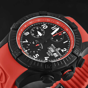 Black stainless steel case with a red rubber strap. Uni-directional rotating black stainless steel bezel. Black dial with black hands and Arabic numeral hour markers. Minute markers around the outer rim. Dial Type: Analog. Luminescent hands and markers. Day of the week and date display at the 3 o'clock position. Chronograph - three sub-dials displaying: 60 second, 30 minute and 12 hour. ETA-Valjoux Caliber 7750 Automatic movement, containing 25 Jewels, bitting at 28800 vph, and has a power reserve of approximately 44 hours. Scratch resistant sapphire crystal. Screw down crown. Transparent case back. Round case shape, case size: 43.5 mm, case thickness: 15.6 mm. Band width: 22 mm, band length: 8 inches. Deployment with push button release clasp. Water resistant at 100 meters / 330 feet. Functions: chronograph, date, day, hour, minute, second. Additional Info: hours, minutes, seconds, day-date, chronograph. Air Speed Series. Luxury watch style. Watch label: Swiss Made. Revue Thommen Air speed Chronograph Black Dial Men's Watch 16071.6776.