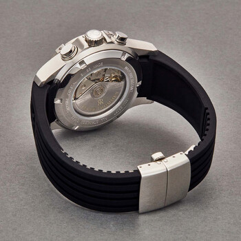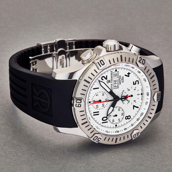 Stainless steel case with a black leather strap. Uni-directional rotating stainless steel bezel. Silver dial with black luminescent, red chronograph hands hands and Arabic numeral hour markers. Minute markers. Tachymeter markers around the outer rim. Dial Type: Analog. Luminescent hands and markers. Day of the week and date display at the 3 o'clock position. Chronograph - three sub-dials displaying: 60 second, 30 minute and 12 hour. ETA-Valjoux caliber 7750 automatic movement, containing 25 Jewels, bitting at 28800 vph, and has a power reserve of approximately 44 hours. Scratch resistant sapphire crystal. Screw down crown. Transparent see through case back. Round case shape. Case size: 45 mm. Case thickness: 15.6 mm. Band width: 22 mm. Fold over clasp with a safety release. Water resistant at 100 meters / 330 feet. Functions: chronograph, tachymeter, date, day of the week, hour, minute, second. Air Speed Xl Series. Sport watch style. Watch label: Swiss Made. Revue Thommen Air Speed XL Chronograph Automatic Silver Dial Men's Watch 16071.6822.