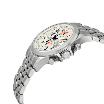 Stainless steel case with a stainless steel bracelet. Fixed stainless steel bezel. Cream dial with black sword-shaped hands and Arabic numeral hour markers. Minute markers. Tachymeter markers around the outer rim. Dial Type: Analog. Luminescent hands and markers. Day of the week and date display at the 3 o'clock position. Chronograph - three sub-dials displaying: 60 second, 30 minute and 12 hour. ETA-Valjoux caliber 7750 automatic movement, containing 25 Jewels, bitting at 28800 vph, and has a power reserve of approximately 44 hours. Scratch resistant sapphire crystal. Transparent case back. Round case shape. Case size: 41 mm. Case thickness: 14 mm. Band width: 20 mm. Fold over clasp with a safety release. Water resistant at 50 meters / 165 feet. Functions: chronograph, date, day, hour, minute, second. Airspeed Pilot Series. Pilot watch style. Watch label: Swiss Made. Revue Thommen Airspeed Pilot Chronograph Automatic Men's Watch 17081.6138.