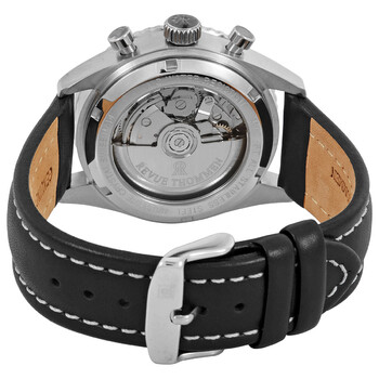 Silver-tone stainless steel case with a black leather strap. Uni-directional rotating silver-tone stainless steel with an inlaid black ring showing tachymeter markings bezel. Silver-tone dial with luminous silver-tone hands and index hour markers. Minute markers around the outer rim. Dial Type: Analog. Luminescent hands and markers. Date display between the 4 and 5 o'clock positions. Chronograph - three sub-dials displaying: 60 second, 30 minute and 12 hour. Sellita Calibre SW510A Automatic movement, based upon Sellita SW500-1, containing 27 Jewels, bitting at 28800 vph, and has a power reserve of approximately 48 hours. Scratch resistant sapphire crystal. Pull / push crown. Transparent case back. Round case shape, case size: 42 mm, case thickness: 15 mm. Band width: 22 mm, band length: 8 inches. Tang clasp. Water resistant at 50 meters / 165 feet. Functions: chronograph, tachymeter, date, hour, minute, second. Aviator Series. Sport watch style. Watch label: Swiss Made. Revue Thommen Aviator Chronograph Automatic Silver Dial Men's Watch 17000.6532.