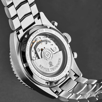 Silver-tone stainless steel case and bracelet. Uni-directional rotating silver-tone stainless steel with an inlaid black ring showing tachymeter markings bezel. Silver dial with luminous silver-tone hands and index hour markers. Arabic numeral minute markers (at 5 minute intervals). Minute markers around the outer rim. Dial Type: Analog. Luminescent hands and markers. Date display between the 4 and 5 o'clock positions. Chronograph - three sub-dials displaying: 60 second, 30 minute and 12 hour. Sellita Calibre SW510A Automatic movement, based upon Sellita SW500-1, containing 27 Jewels, bitting at 28800 vph, and has a power reserve of approximately 48 hours. Scratch resistant sapphire crystal. Pull / push crown. Transparent case back. Round case shape, case size: 42 mm, case thickness: 15 mm. Band width: 22 mm, band length: 8 inches. Fold over clasp. Water resistant at 50 meters / 165 feet. Functions: chronograph, tachymeter, date, hour, minute, second. Aviator Series. Sport watch style. Watch label: Swiss Made. Revue Thommen Aviator Chronograph Automatic Silver Dial Men's Watch17000.6132.