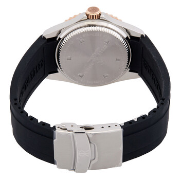 Stainless steel case with a black rubber strap. Uni-directional rotating rose gold-tone bezel with an inlaid black ring. Black dial with luminous rose gold-tone hands and dot hour markers. Minute markers around the outer rim. Dial Type: Analog. Luminescent hands and markers. Date display at the 3 o'clock position. Automatic movement. Scratch resistant sapphire crystal. Solid case back. Round case shape. Case size: 42 mm. Case thickness: 13 mm. Band width: 22 mm, band length: 8 inches. Deployment clasp with a push button release. Water resistant at 300 meters / 1000 feet. Functions: date, hour, minute, second. Diver Series. Luxury watch style. Watch label: Swiss Made. Revue Thommen Diver Automatic Black Dial Men's Watch 17571.2857.