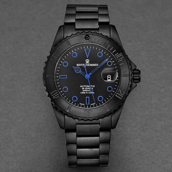Black stainless steel case and bracelet. Uni-directional rotating black stainless steel bezel. Black dial with blue hands and index hour markers. Minute markers around the outer rim. Dial Type: Analog. Date display at the 3 o'clock position. Sellita Caliber SW200 Automatic movement, containing 26 Jewels, bitting at 28800 vph, and has a power reserve of approximately 38 hours. Scratch resistant sapphire crystal. Screw down crown. Solid case back. Round case shape, case size: 42 mm, case thickness: 13 mm. Band width: 22 mm, band length: 8 inches. Fold over clasp with a safety release. Water resistant at 300 meters / 1000 feet. Functions: date, hour, minute, second. Additional Info: hours, minutes, seconds, date. Diver Series. Luxury watch style. Watch label: Swiss Made. Revue Thommen Diver Automatic Black Dial Men's Watch 17571.2675.