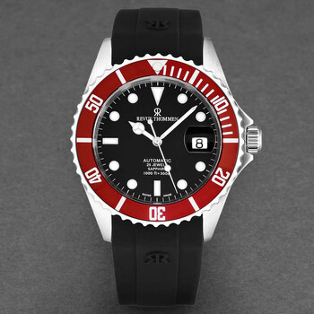 Silver-tone stainless steel case with a black rubber strap. Uni-directional rotating red stainless steel bezel. Black dial with silver-tone hands and index hour markers. Minute markers around the outer rim. Dial Type: Analog. Luminescent hands and markers. Date display at the 3 o'clock position. Automatic movement. Scratch resistant sapphire crystal. Screw down crown. Solid case back. Round case shape, case size: 42 mm, case thickness: 12.65 mm. Band width: 22 mm, band length: 8 inches. Deployment with push button release clasp. Water resistant at 300 meters / 1000 feet. Functions: date, hour, minute, second. Diver Series. Luxury watch style. Watch label: Swiss Made. Revue Thommen Diver Automatic Black Dial Men's Watch 17571.2836.